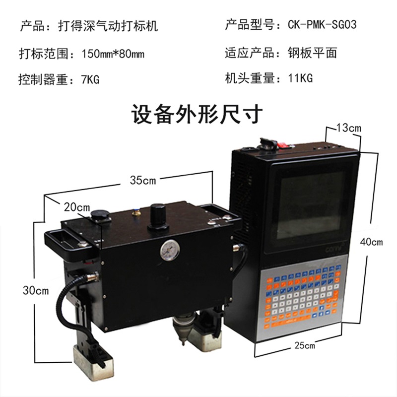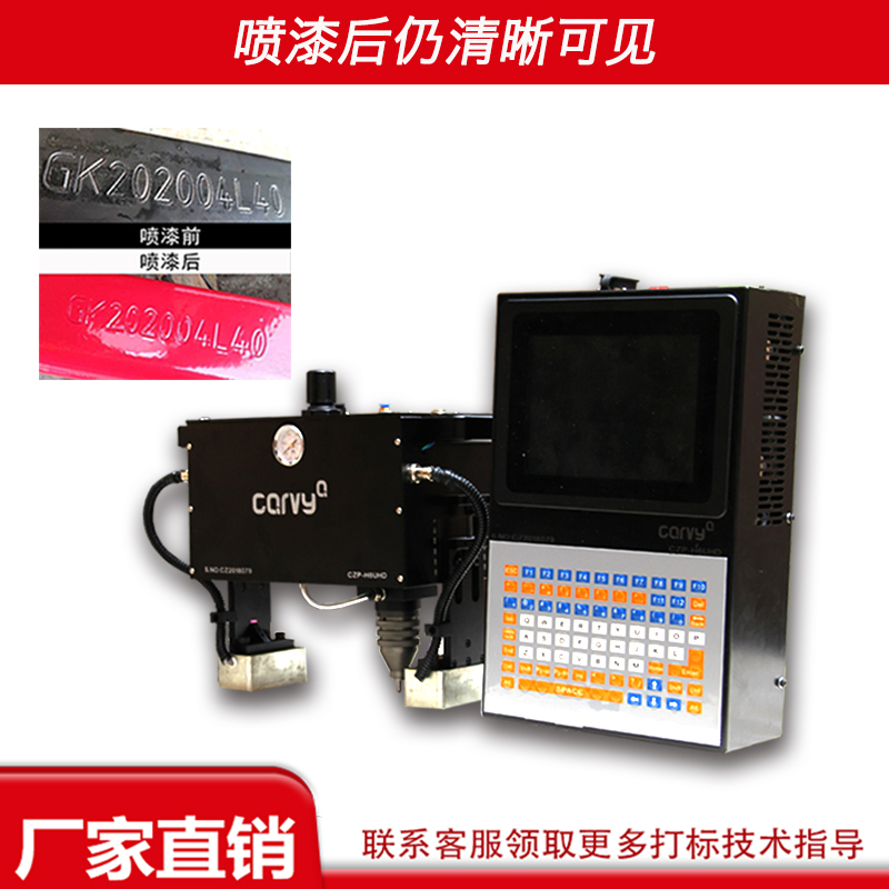 深度气动打标机是我司研发的一款可以打深度的打标机设备,设备小巧,移动方便,标记深度可以达到0.5mm-1mm,喷漆、镀锌、抛丸都清晰可见,是户外打标的理想设备。本设备适合于在大型工件和不易移动的工件上打印各种文字、商标、流水号,VIN码等。 该款气动打标设备采用电脑直接打标输出,标记工整清晰;主要典型应用:汽摩零部件、仪器仪表,机械、汽车、标牌等行业。