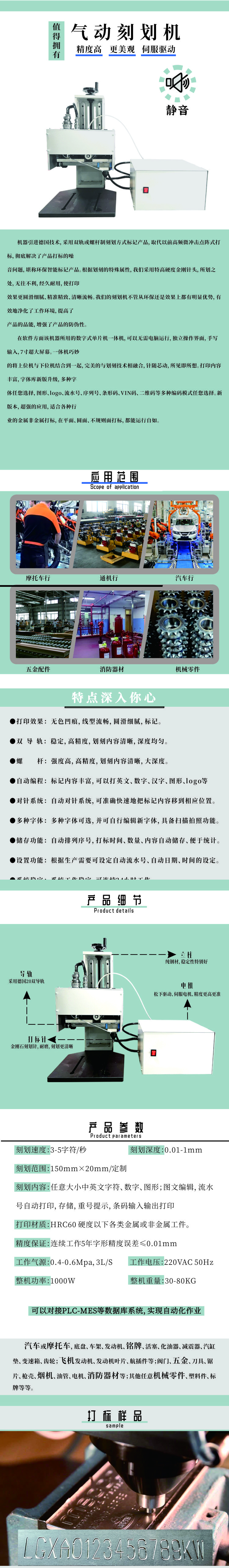对于有划刻深度、无噪音、耐磨损等场合有高要求的用户,在选择标记产品设备时,气动刻划机是不错的选择。其工作时噪音小,打印深度可根据需求自行调节;并且对工件表面光洁度没有要求,刻划时线条流畅,划刻的字符清晰,喷涂处理后拓印效果依然良好,适用于大部分金属及非金属工件的打标要求。