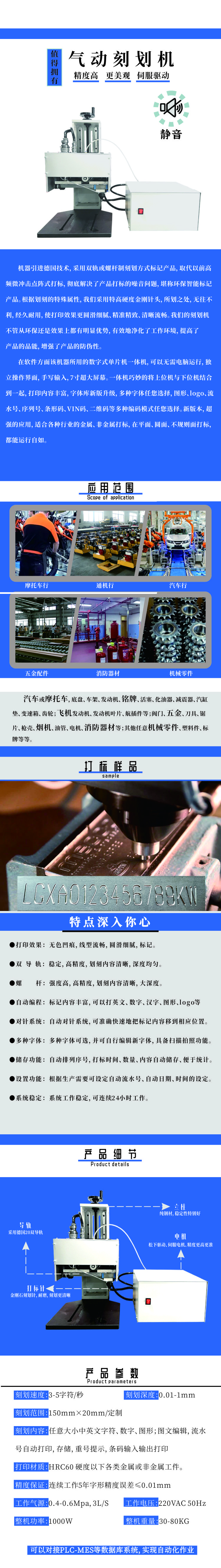 气动划刻机是气动打标机的其中一种,刻划是指用硬质合金或金刚石针在材料表面刻出文字和LOGO等,在圆面,平面,凹面或供面上刻出凹槽而形成连续直线,并且适用于任何材质。也被称为“划线”式打标。其适用于车架号、不锈钢、法兰、发动机号、铭牌、钢瓶等多种行业加工,特别适用于对划刻深度有特殊要求:如汽车VIN、钢材热处理前标识、阀门深度、石油管道标识等。