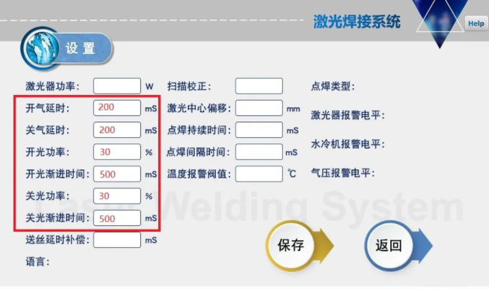 3、设置参数尽量给予缓升缓降,如开/关气延时200-500ms,开/关光功率20%,开/关光渐进时间200-300ms,如图不可设0;